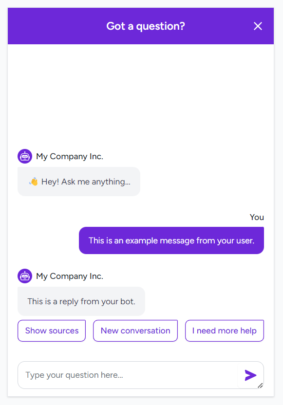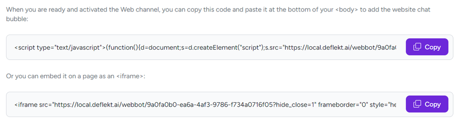 The final snippet is an <iframe> snippet you can copy/paste on the location you want a chat panel to show up on your website. You will need to set the height according to your wishes in the snippet (the default is 760px. You can further style the iframe to your liking (set a border, set the width, etc.) using CSS.