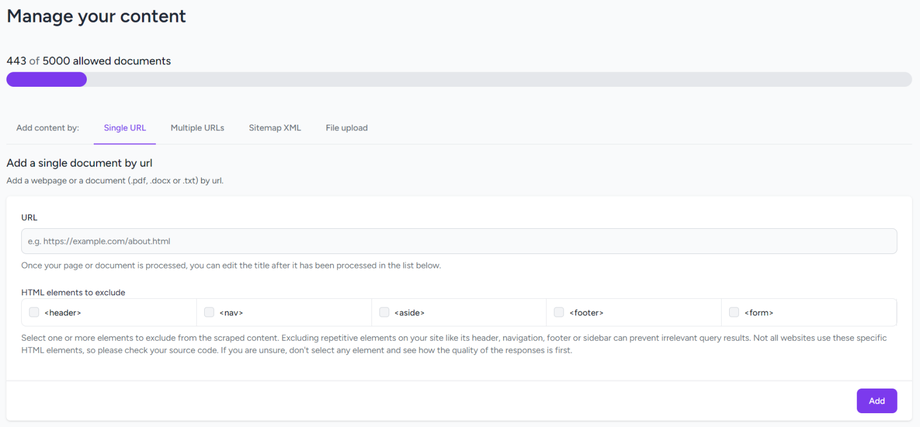 First step is to decide what you want to ingest. If the content you want to ingest is online and not protected by a login or other form of authentication, the easiest way is to ingest by url. If you want to handpick some pages (ie. your FAQ page, pricing page, how-to page) you can do that one-by-one by selecting Single URL. You can also collect the urls first and list them comma separated by using Multiple URLs. These urls can also point to files that are hosted (like PDF brochures or guides).
