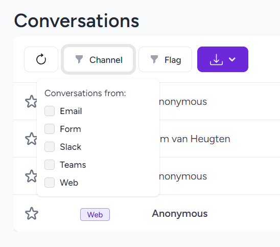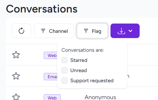 Second is the Flag filter with which you can filter starred, unread and support requested conversations. You are able to manually star conversations, so you can bundle them later on. Unread lets you see conversations you haven't evaluated before and finally with the support requested filter you easily surface all conversations that led to a user requesting your additional human support.